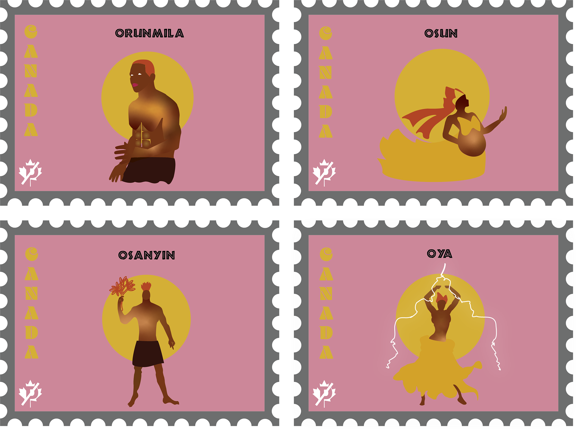 A series of stamps were created for the Canadian Postal Service to add to their permanent collection. These stamps were based on mythological African gods that are believed to have existed between 500 - 300 BCE.